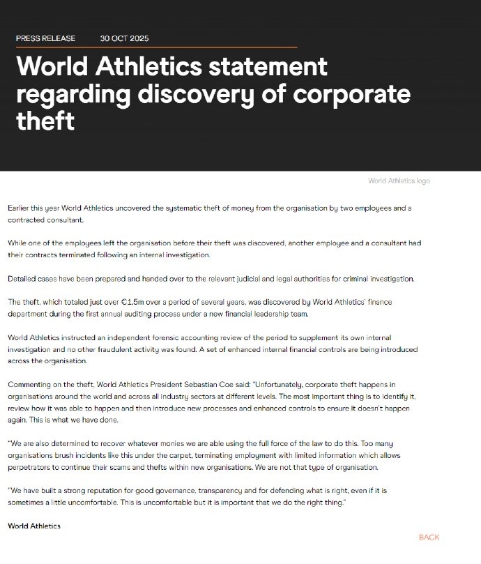 今年早些时候,世界田径联合会揭露了两名员工和一名顾问从该组织系统性盗窃资金的行为。 其中一名员工在盗窃行为被发现前已经离职,另一名员工和顾问则在内部调查后被终止合同。详细的案件资料已提交给相关司法和法律机构进行刑事调查。