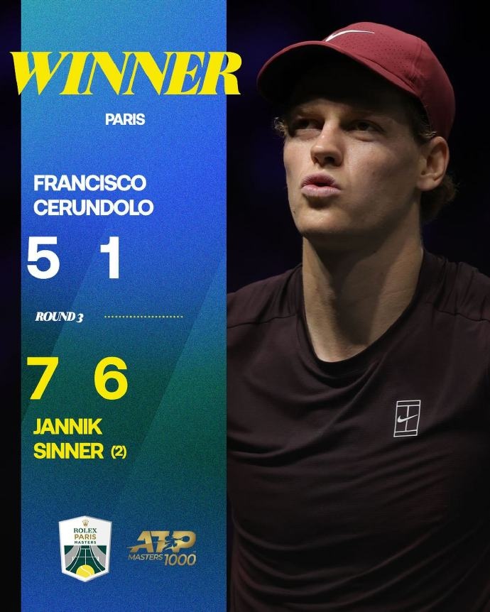 强!辛纳2-0塞伦多洛,晋级巴黎大师赛8强,解锁大师赛全8强成就
