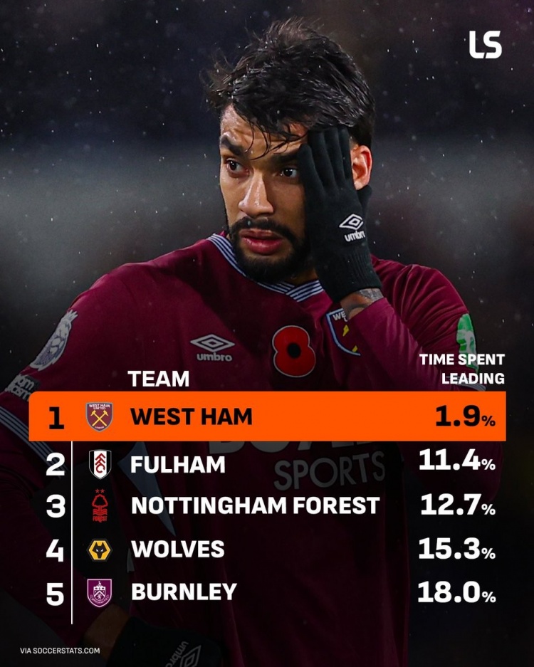 据统计,西汉姆本赛季仅1.9%的比赛时间处于领先,位居联赛垫底。