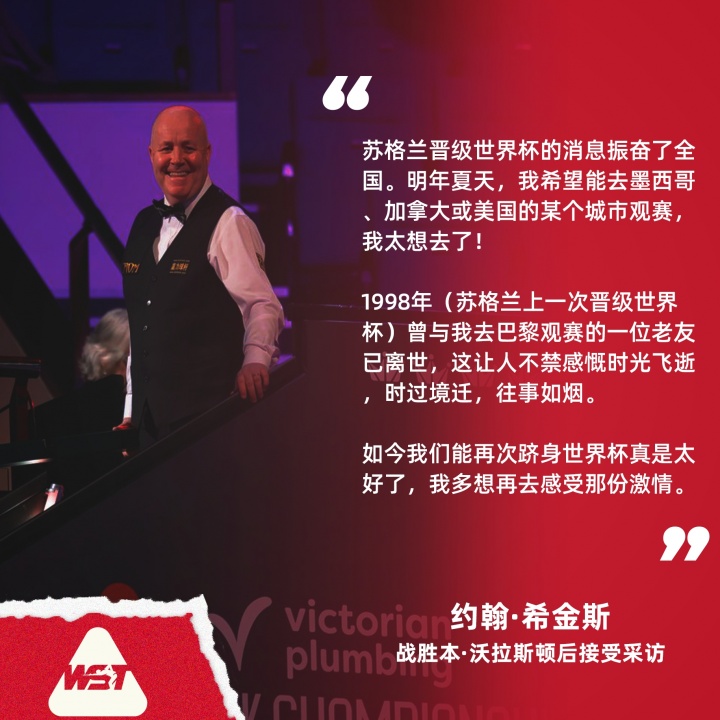 希金斯表示:苏格兰晋级世界杯的消息振奋了全国。明年夏天,我希望能去墨西哥、加拿大或美国的某个城市观赛,我太想去了!