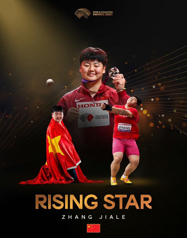 直播吧12月1日讯 世界田联官方公布2025年度各项最佳得主,中国19岁链球小将张家乐获得年度女运动员新星奖。