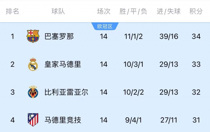皇马三连平让出榜首,巴萨1分优势登顶。黄潜排名第三扮演搅局者。