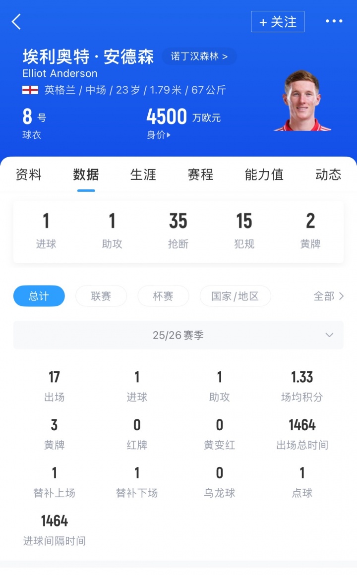 报道称,埃利奥特·安德森吸引了曼城关注,曼城总监维亚纳以及球探团队本赛季已经不下十次考察球员。
