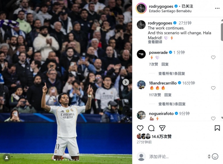 本场比赛罗德里戈率先破门,打破个人连续32场进球荒,他在社媒晒出本场照片,配文写道:“还要继续努力,我们会改变现状,Hala Madrid! ?⚡️”