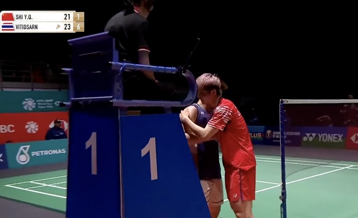 比赛第一局,石宇奇21-23先丢一局;第二局石宇奇在1-6时选择退赛。