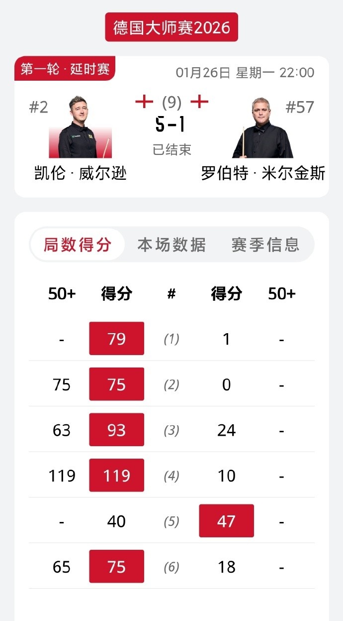 威尔逊打出单杆119分,开局连拿4局,最终以5-1击败米尔金斯。
