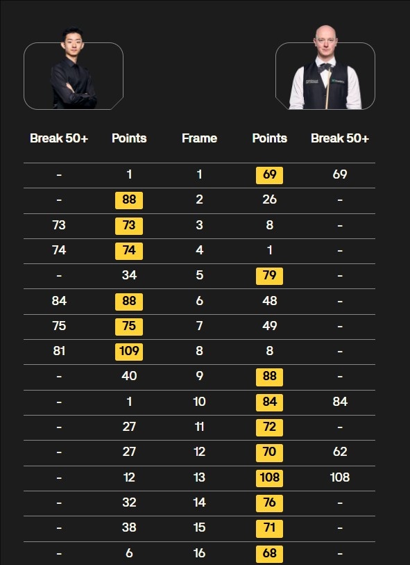第一阶段过后吴宜泽6-2领先克里斯·韦克林,第二阶段克里斯·韦克林连胜八局逆转获胜。